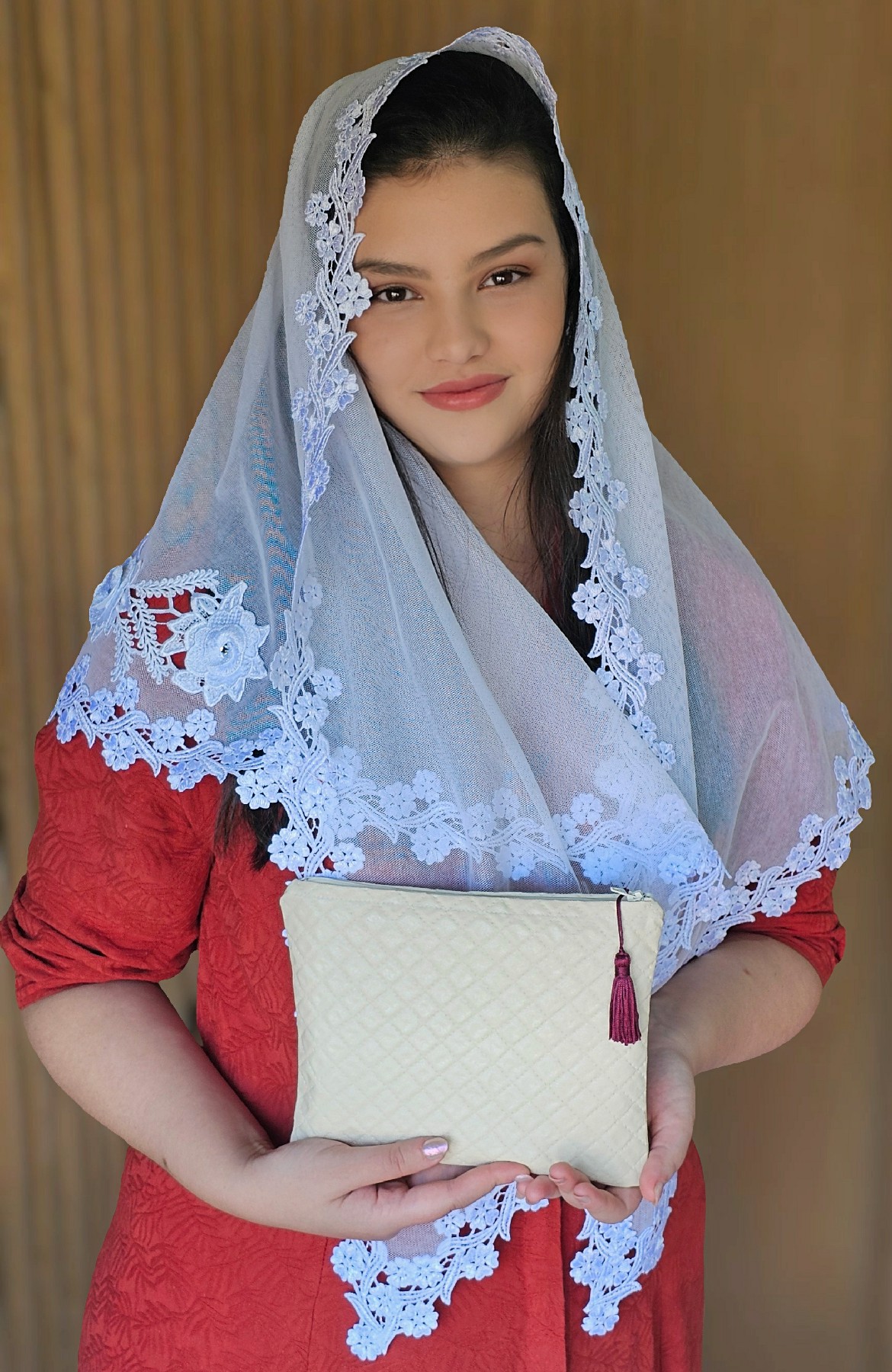 RETANGULAR = Também conhecido como Véu Quadrado, é o formato mais tradicional, o primeiro a existir, muito antes do Bico/Oval. Muitas irmãs ainda preferem esse formato. Ele é literalmente um retângulo, com a frente e costas retas, e com 4 bicos. Para quem prefere usar véus maiores, a grande vantagem do véu retangular é ser maior que o véu Bico/Oval. E talvez a maior desvantagem é por não serem anatômicos, as vezes costumam “embolar” no pescoço.