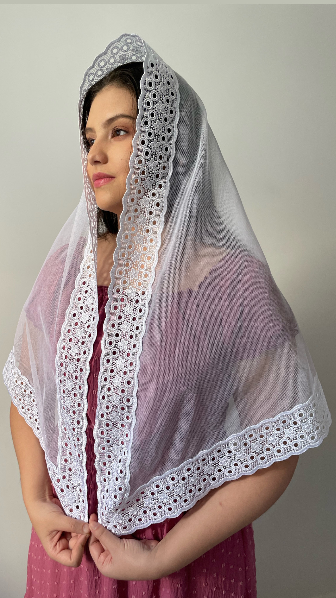 RETANGULAR = Também conhecido como Véu Quadrado, é o formato mais tradicional, o primeiro a existir, muito antes do Bico/Oval. Muitas irmãs ainda preferem esse formato. Ele é literalmente um retângulo, com a frente e costas retas, e com 4 bicos. Para quem prefere usar véus maiores, a grande vantagem do véu retangular é ser maior que o véu Bico/Oval. E talvez a maior desvantagem é por não serem anatômicos, as vezes costumam “embolar” no pescoço.