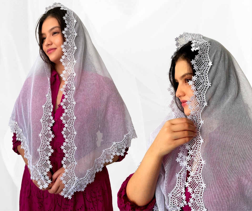 RETANGULAR = Também conhecido como Véu Quadrado, é o formato mais tradicional, o primeiro a existir, muito antes do Bico/Oval. Muitas irmãs ainda preferem esse formato. Ele é literalmente um retângulo, com a frente e costas retas, e com 4 bicos. Para quem prefere usar véus maiores, a grande vantagem do véu retangular é ser maior que o véu Bico/Oval. E talvez a maior desvantagem é por não serem anatômicos, as vezes costumam “embolar” no pescoço.