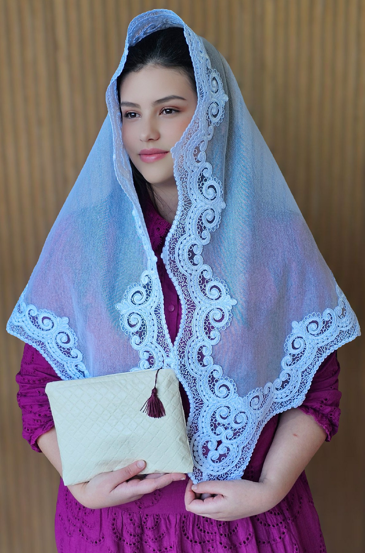 RETANGULAR = Também conhecido como Véu Quadrado, é o formato mais tradicional, o primeiro a existir, muito antes do Bico/Oval. Muitas irmãs ainda preferem esse formato. Ele é literalmente um retângulo, com a frente e costas retas, e com 4 bicos. Para quem prefere usar véus maiores, a grande vantagem do véu retangular é ser maior que o véu Bico/Oval. E talvez a maior desvantagem é por não serem anatômicos, as vezes costumam “embolar” no pescoço.